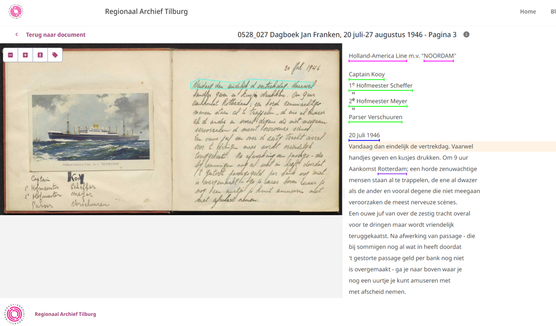 Hoe wordt zo’n automatische transcriptie nou gemaakt? In Transkribus worden er lijntjes onder alle tekstregels getekend, zodat het programma goed kan zien waar de tekst begint en eindigt. Daarna wordt de automatische tekstherkenning aangezet. Door middel van afbeeldingsherkenning vergelijkt het programma de vormen van de letters en cijfers in het dagboek met voorbeelden die het al eerder gezien heeft in zijn database. Combineer dat met de juiste taalinstellingen en er wordt een letterlijke transcriptie in het Nederlands van 1946 in elkaar gezet. Deze is nog niet helemaal foutloos. Het programma kan alleen vertalen wat het goed kan zien. Onduidelijke kriebels die met menselijke intuïtie wel nog in te vullen zijn, zal het programma dan ook niet kunnen oplossen. De transcriptie wordt daarom door vrijwilligers gecorrigeerd, en namen, plaatsen en data worden als belangrijke informatie gemarkeerd. Tot slot wordt het document gepubliceerd op onze Transkribus pagina, waar men zonder al te veel moeite kan ontdekken wat de familie Franken allemaal in Amerika beleefd heeft…