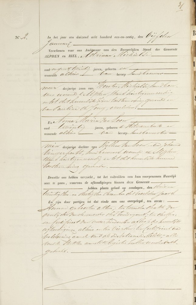 De aangifte van de geboorte geschiedt op 1 september 1840. De waarschijnlijke geboortedatum is dus 31 augustus 1840. Anna Maria van Loon trouwt te Alphen en Riel op 5 januari 1861 met Adriaan Michielse:
