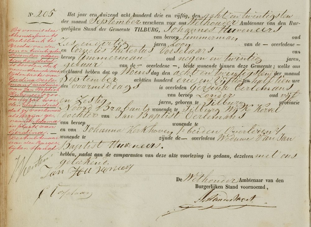 In haar overlijdensakte wordt zij abusievelijk Gerdina genoemd. Deze fout is pas hersteld door een vonnis van de arrondissementsrechtbank Breda van 21 december 1900, zoals blijkt uit de kantmelding. Een afschrift van dit vonnis is ingeschreven in het overlijdensregister van Tilburg op 6 januari 1901 (akte 7). En dan wordt de reden duidelijk van deze late naamscorrectie. Een minderjarige kleinzoon van Adama Oerlemans, Joannes Maria Huveneers, heeft trouwplannen. Zijn ouders zijn reeds overleden en omdat hij minderjarig is heeft hij dan huwelijkstoestemming van zijn grootouders nodig. Deze waren ook al overleden en bij het lichten van hun overlijdensakten is gebleken dat de voornaam van de grootmoeder van vaderskant niet goed in haar overlijdensakte was vermeld. Joannes Maria Huveneers trouwde op 16 januari 1901 (akte 14) te Tilburg met Goverdina Catharina Kuijten.