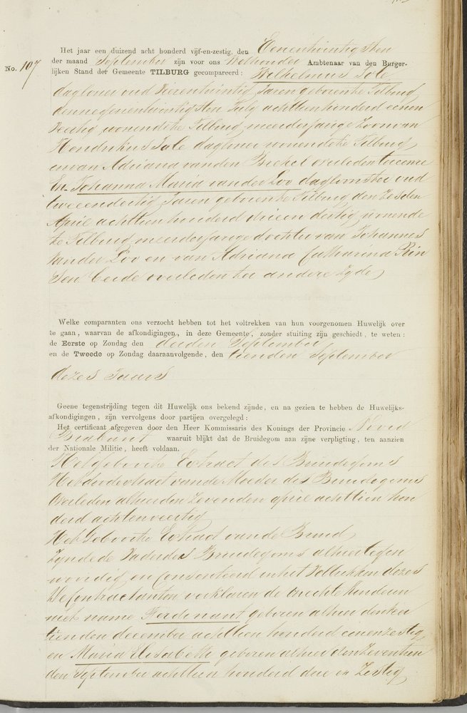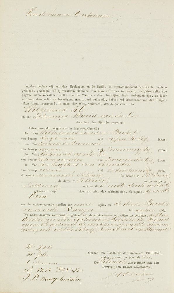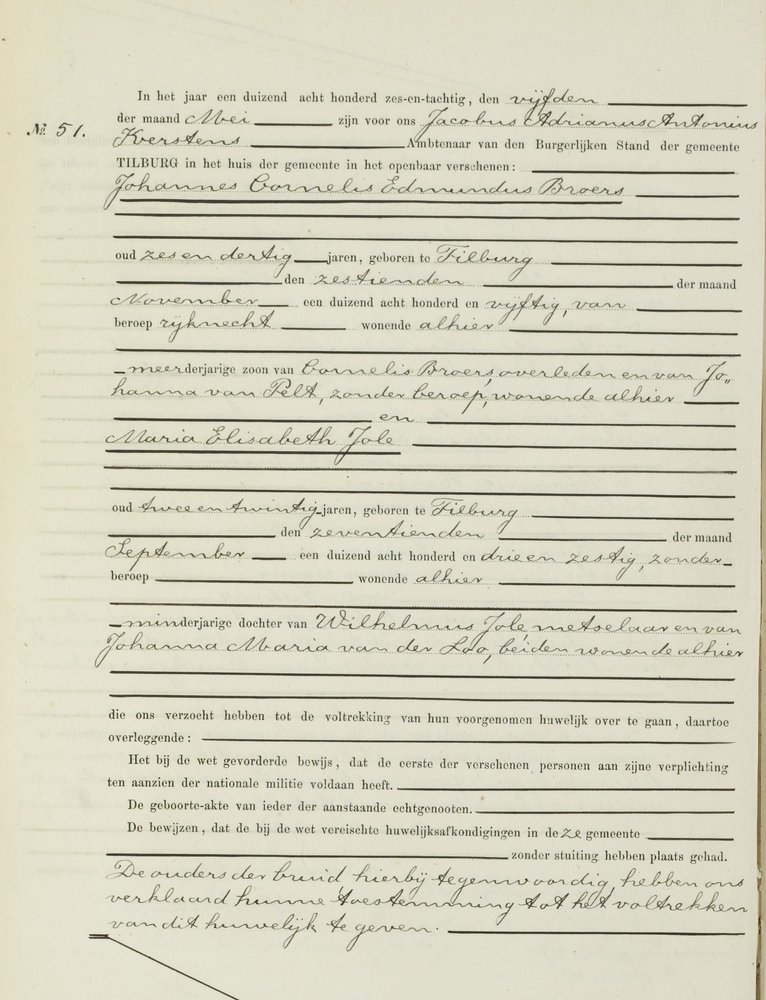 Bijna twee jaar na de geboorte van het jongste kind heeft zij trouwplannen. De a.s. bruidegom is Wilhelmus Jole, geboren Tilburg 29 juli 1841. Hij wil de drie kinderen van zijn a.s. echtgenote bij hun huwelijk erkennen. Maar daar steekt de ambtenaar van de burgerlijke stand een stokje voor. Met het erkennen van de jongste twee kinderen heeft hij geen problemen, maar met het oudste wel. Wilhelmus Jole is het niet met de ambtenaar eens en wil ook het oudste kind als het zijne erkennen. Het enige dat hem dan nog rest is een verzoek daartoe in te dienen bij de arrondissementsrechtbank te ’s-Hertogenbosch. En dat doet hij dan ook op 13 september 1865 (zie BHIC, toegang 24: Archief van de Arrondissementsrechtbank te ’s-Hertogenbosch 1838-1929, inv. nr. 1191). Wilhelmus Jole, dagloner, geboren te Tilburg 29 juli 1841, geeft met verschulden eerbied te kennen dat hij voornemens is een huwelijk aan te gaan met Johanna Maria van der Loo, waarvan de eerste afkondiging heeft plaatsgehad op den vierden dezer maand en dat hij in overeenstemming met zijne bruid voornemens is ter gelegenheid van zijn huwelijk de drie bij haar verwekte kinderen te wettigen waarvan het eerste geboren is den 18 Augustus 1852 en de anderen in 1861 en 1863, dat tegen het wettigen van het oudste kind door den heer ambtenaar van den Burgerlijken Stand zwarigheden worden geopperd als kúnnende hij requestrant niet de natuurlijke vader van het kind zijn. Eind van het verhaal is dat de officier van justitie de ambtenaar van de burgerlijke stand gelijk geeft omdat uit het geringe verschil van ouderdom tusschen de requestrant en Cornelis van der Loo blijkt, dat het "physisch onmogelijk is dat de requestrant dit kind kan hebben verwekt en dat het dus zeker is dat een ander dan hij de vader is". Bij het op 21 september 1865 te Tilburg gesloten huwelijk tussen Wilhelmus Jole en Johanna Maria van der Loo worden dus slechts twee kinderen erkend: