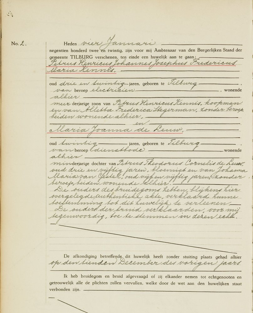In 1922 trouwde Petrus Henricus Johannes Josephus Fredericus Maria Kennis met Maria Joanna de Leuw te Tilburg: