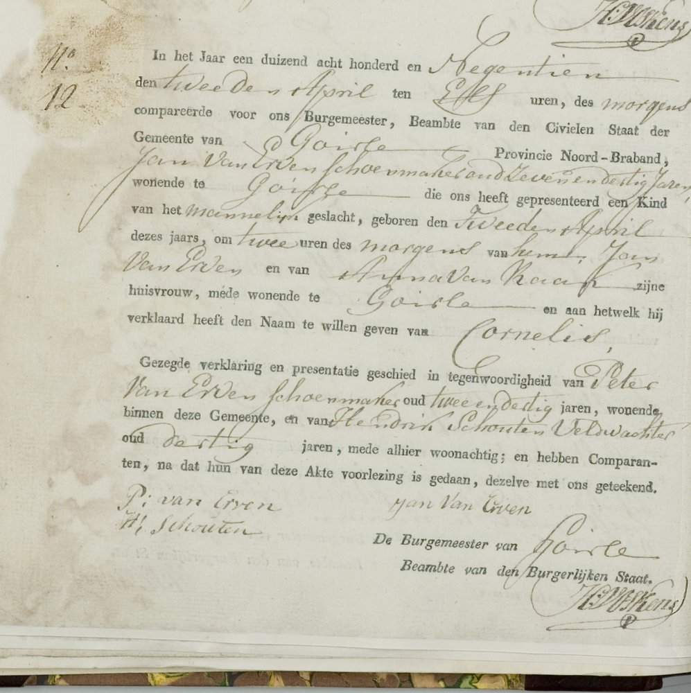 Het derde kind is Cornelis van Erven, zoon van eerdergenoemde Jan van Erven en Anna van Raak, geboren 2 april 1819 om 2 uur ´s morgens: