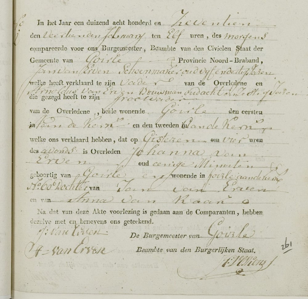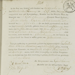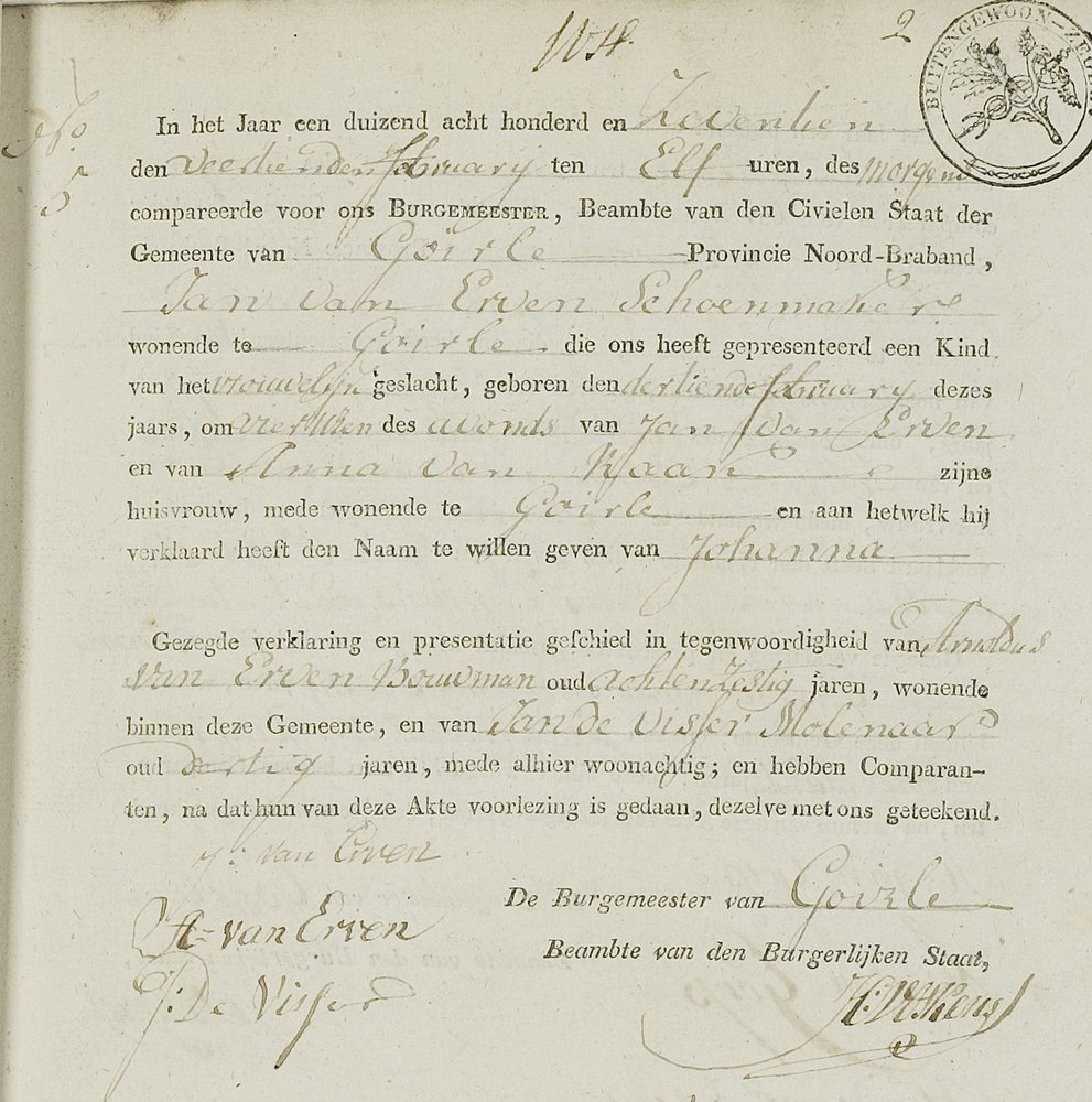 Op 13 februari 1817 werd om 4 uur ´s avonds geboren: Johanna, dochter van Jan van Erven en Anna van Raak. De aangifte van de geboorte geschiedde op 14 februari 1817 om 11 uur ´s morgens: