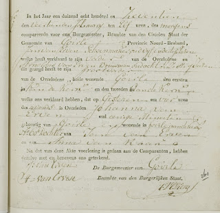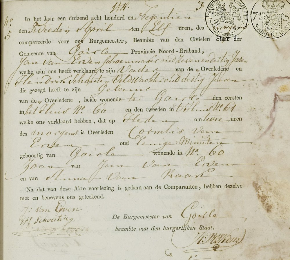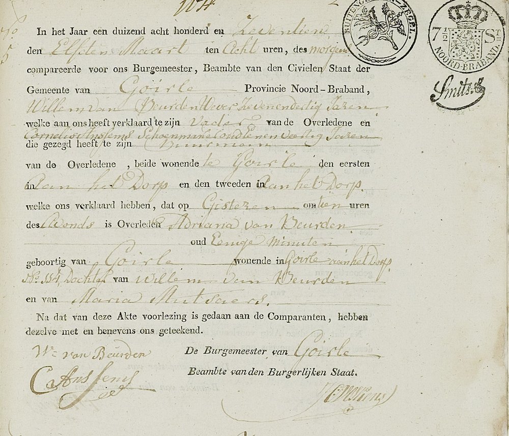 Zowel de aangifte van geboorte als van overlijden geschiedde op 2 april 1819 om 11 uur ´s morgens.