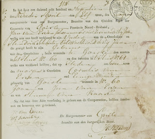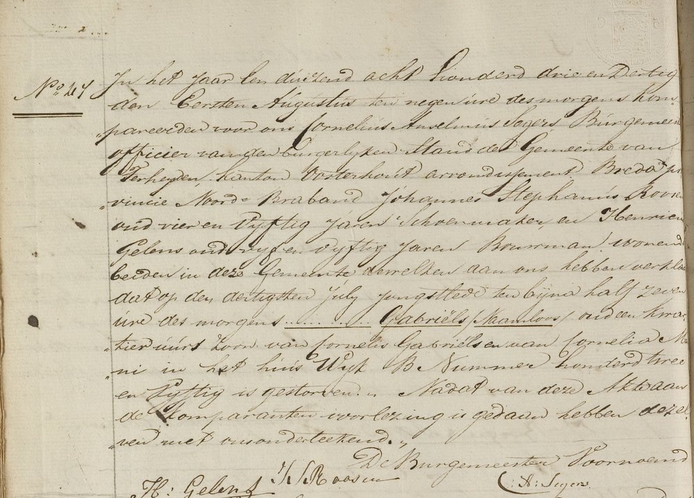 Ook in Terheijden werd op 30 juli 1833 om 6 uur ´s morgens een naamloze zoon geboren van Cornelis Gabriels en Cornelia Manni. De aangifte van de geboorte geschiedde op 30 juli 1833 om 9 uur ´s morgens: