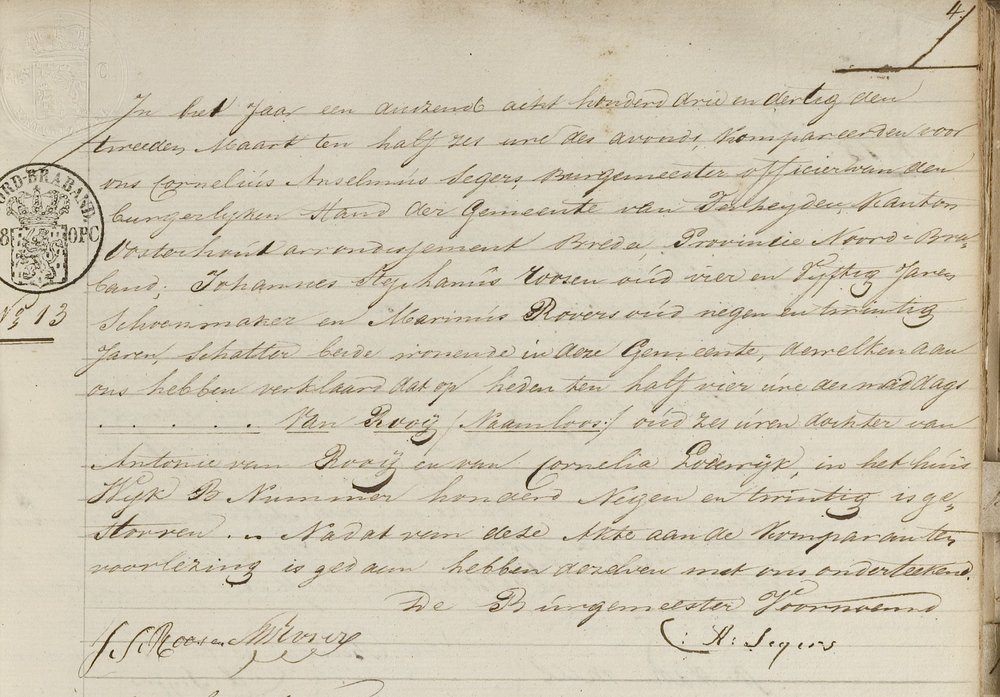 Op 2 maart 1833 werd om half zes ´s avonds aangifte gedaan van het overlijden van een naamloze dochter, oud 6 uur, overleden 2 maart 1833 om half vier ´s middags, dochter van Antonie van Rooij en Cornelia Lodewijk: