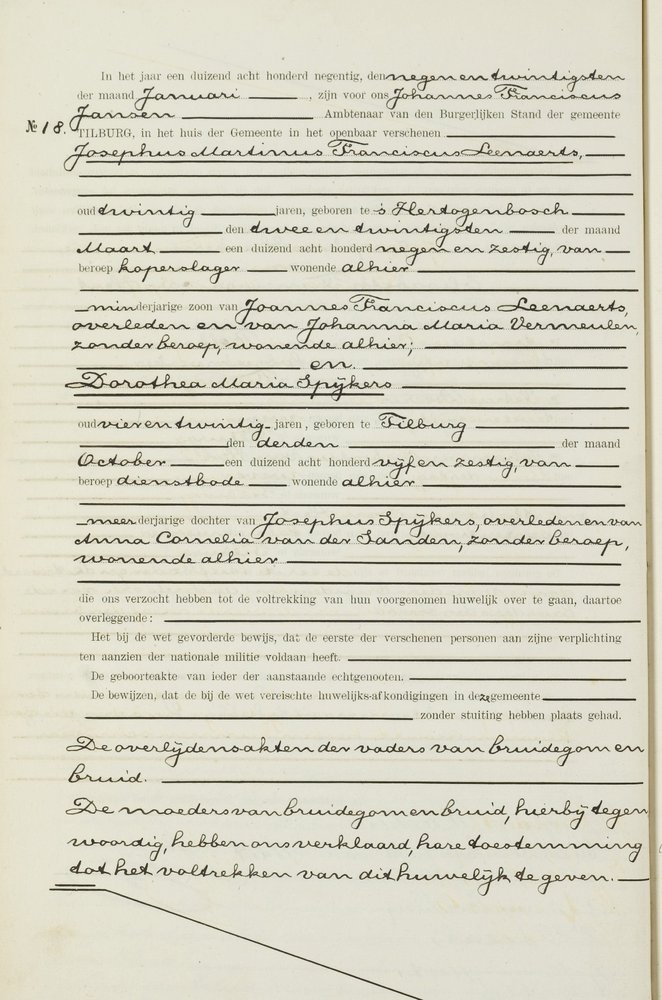 Op 29 januari 1890 trouwden Josephus Martinus Franciscus Leenaerts met Dorothea Maria Spijkers te Tilburg. Een van de getuigen was de 52-jarige Josephus Franciscus Antonissen, halve zwager van de bruidegom: