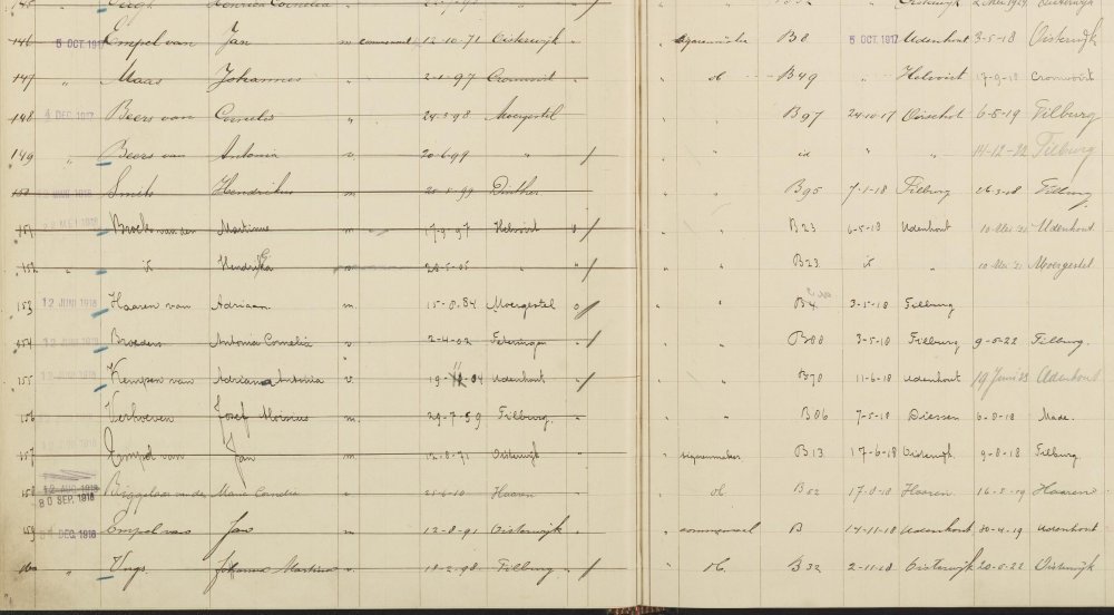 Papier is geduldig. En dat geldt vaak voor bevolkingsregisters.Het gebeurt nogal eens, dat geboortedata verkeerd worden vermeld. Controle met behulp van de registers van de burgerlijke stand is dan ook noodzakelijk. Bekijk bijvoorbeeld onderstaande pagina uit het bevolkingsregister van Berkel-Enschot deel 16, dienstboden 1910-1924, blad 48: