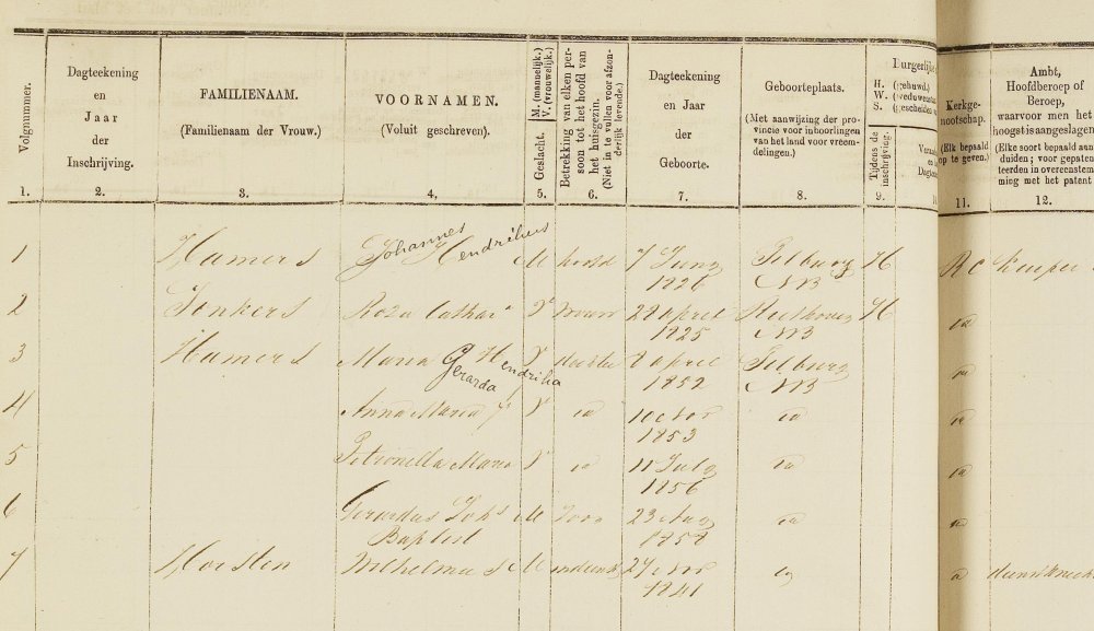 Een voorbeeld waarbij het bevolkingsregister niet goed is bijgehouden levert Tilburg ons. In het register van 1870-1880 van Tilburg deel 1 pagina 2 wordt het gezin van Johannes Hamers en Rosalia Jonkers vermeld: