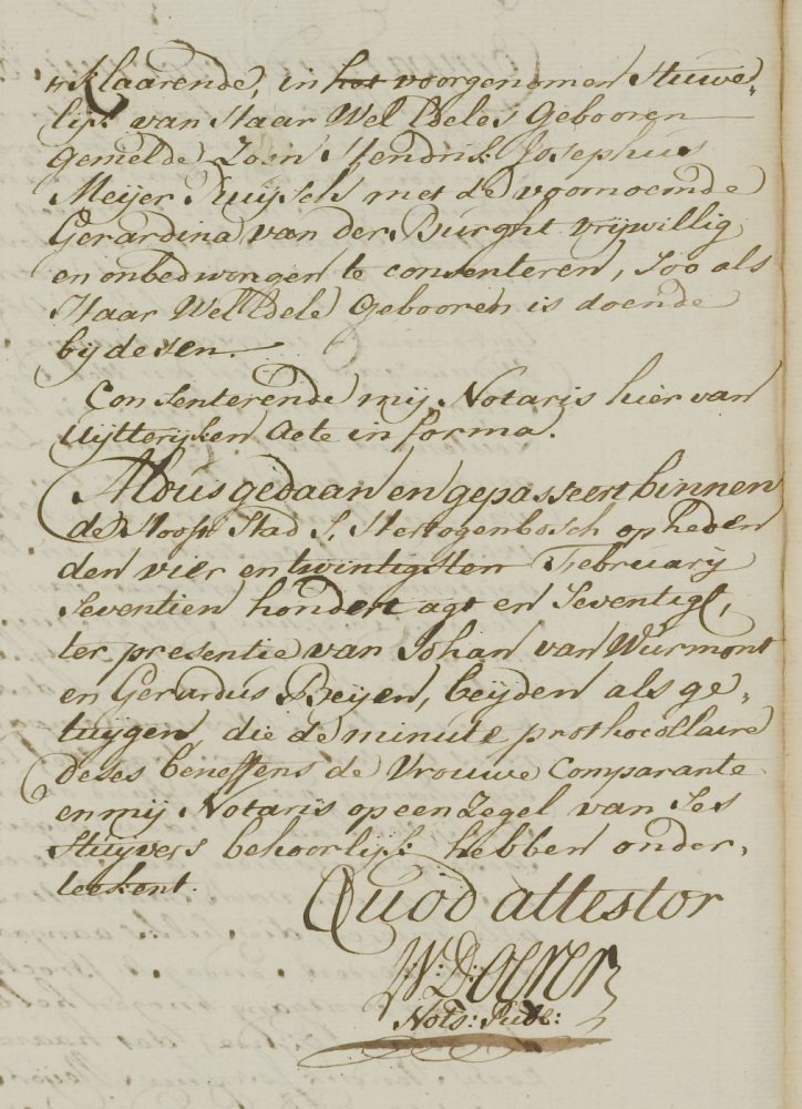 De bruidegom krijgt bij notariële akte huwelijkstoestemming van zijn moeder Gijsberdina Diederica Johanna Ruijsch, weduwe van Johannes Meijer (DTB 12 Baarle-Nassau, scans 41 en 42):