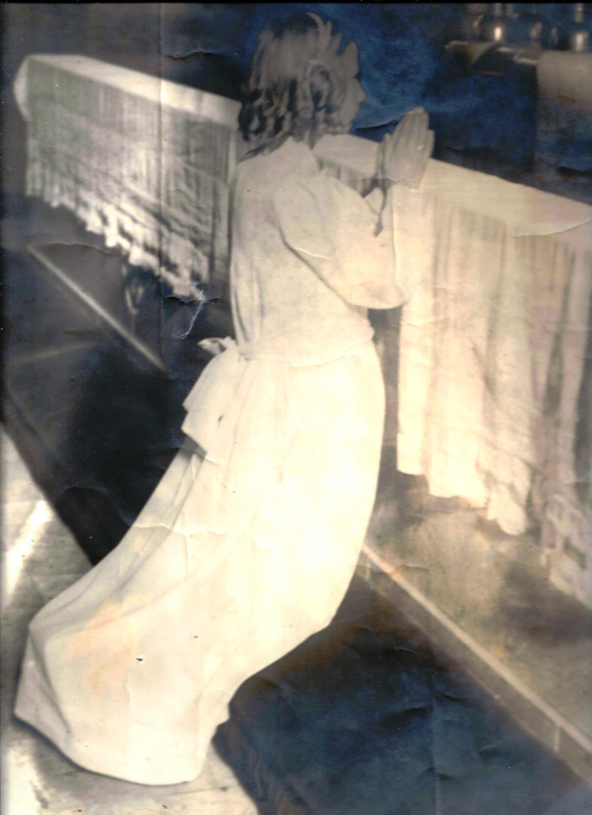 Devoot knielend zien we een jong meisje voor het altaar. Met de processiekleding knielend voor het altaar van de parochiekerk Heilige Margarita Maria aan de Ringbaan West poseert het meisje. De kerk is de laatste jaren veel in het nieuws gekomen vanwege het vroege luiden van de klokken.