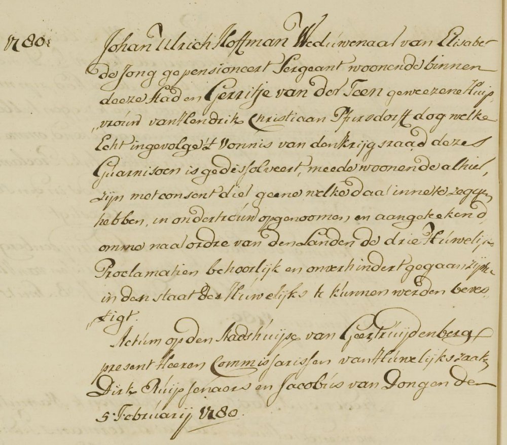 Ook in Geertruidenberg is in 1780 het huwelijk voltrokken tussen Johan Ulrich Hoffman en Gerritje van der Teen, in huwelijk gehad hebbende Hendrik Christiaan Pfirsdorff. Haar eerste huwelijk is door echtscheiding ontbonden (DTB 10 Geertruidenberg scan 58):