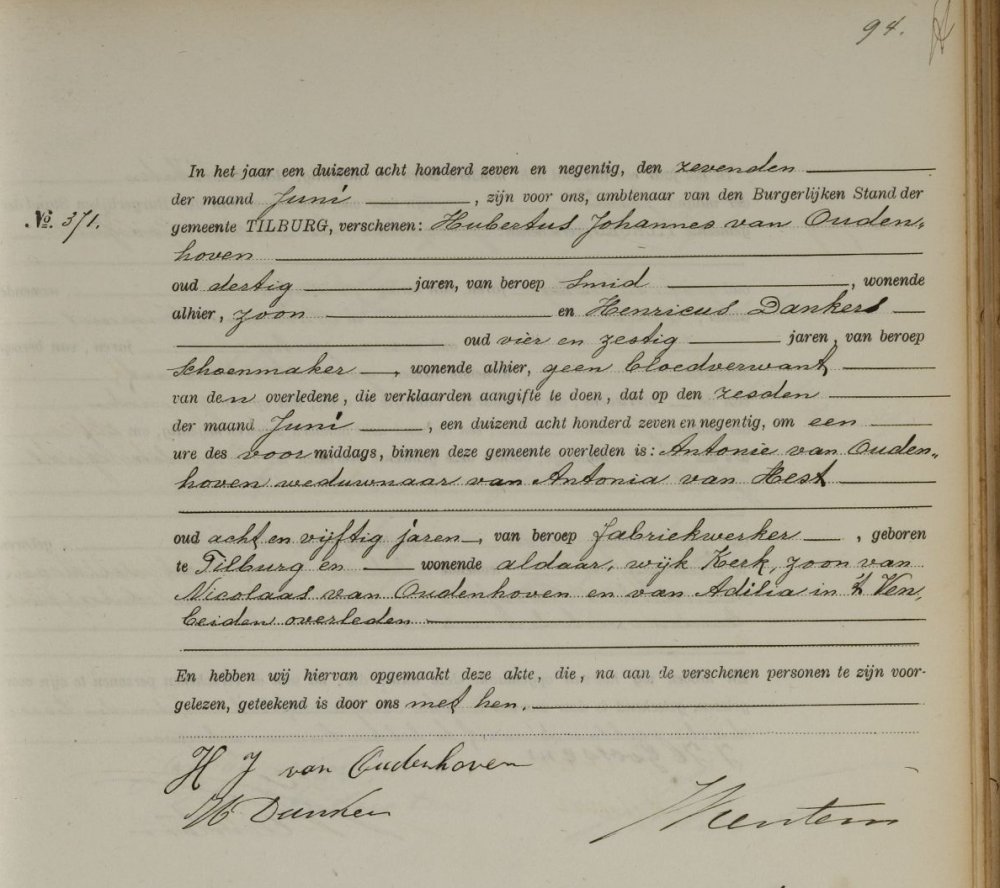 Grootvader Antonie van Oudenhoven overleed op 6 juni 1897 te Tilburg: