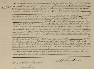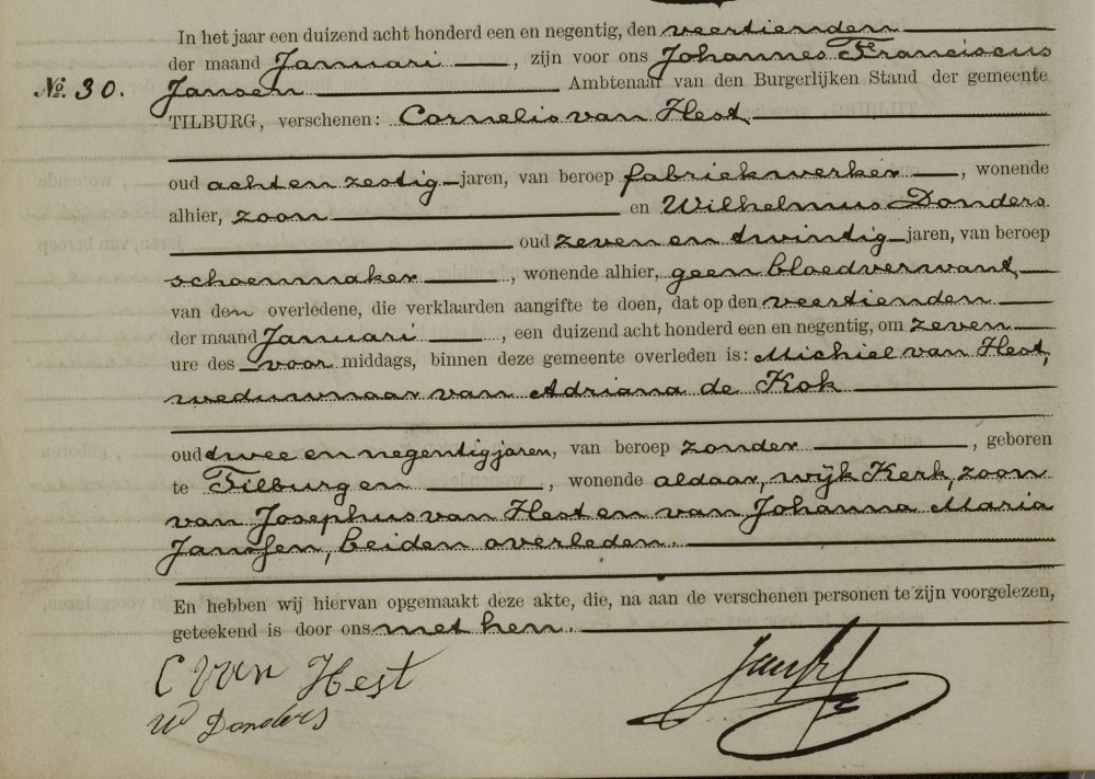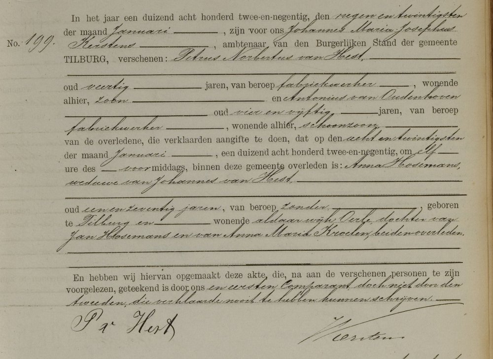 Uit deze akte blijkt dat de vader van de bruidegom en de moeder van de bruid reeds waren overleden. Antonia van Hest, de moeder van de bruid, overleed op 24 december 1881 te Tilburg:
