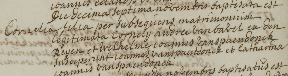 Dan is de akte van ondertrouw te Dongen van 23 november 1771 heel wat duidelijker. Cornelis Andries van Bavel verklaart vader te zijn van het kind waarvan de a.s. bruid Willemijntje Janzen van Spaandonk op de 17 november 1771 is bevallen (DTB 38 Dongen scan 79):