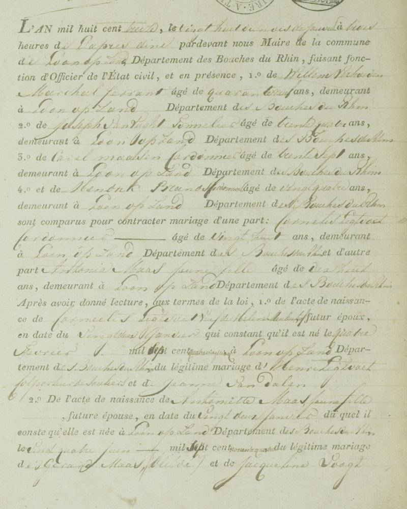 Zoals vroeger op de lagere school in de vijfde klas bij de Franse les werd geleerd: tachtig is in het Frans quatre-vingt en negentig quatre-vingt dix. Maar daar dacht de ambtenaar van de burgerlijke stand te Loon op Zand in 1813 anders over. Op 28 januari 1813 trouwden Cornelis Ligtvoet en Antonia Maas. De bruid is in 1794 geboren, maar hoe zeg je vier-en-negentig in het Frans? De ambtenaar dacht: nonante quatre!:
