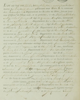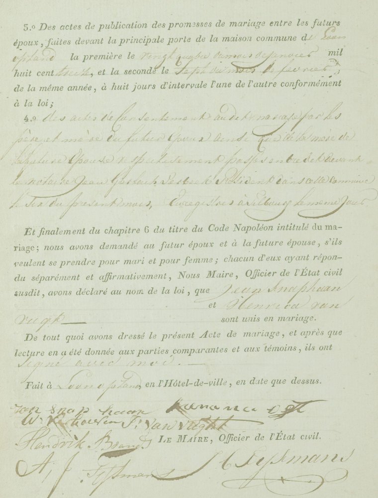 Bij de tweede huwelijksakte waren er geen problemen. Maar bij akten 3, 4 en 5 volstond de ambtenaar met het vermelden de geboortedag en waagde zich niet aan het vertalen van het geboortejaar, waardoor in deze akten bruiden en bruidegoms allen in het jaar 1800 zijn geboren (mil huit cent is voorgedrukt), zoals op 11 februari 1813 (akte 3) toen Jean Snaphaan en Henrica van Vugt trouwden: