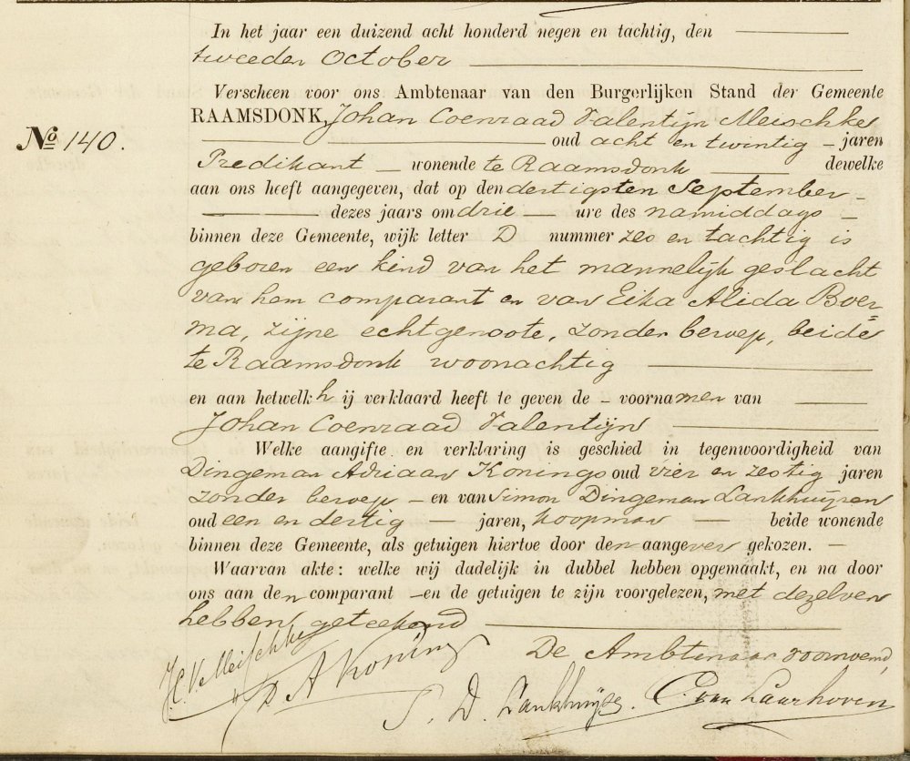 Op 30 september 1889 wordt er te Raamsdonk een jongetje geboren, met dezelfde voornamen Johan Coenraad Valentijn als zijn vader: