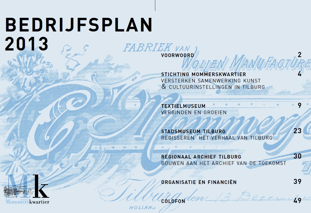 In het eerste kwartaal van ieder jaar presenteren we in het bedrijfsplan wat we allemaal gaan doen in dat jaar. Dat wordt samen met de plannen van TextielMuseum en Stadsmuseum Tilburg gebundeld in het Bedrijfsplan Stichting Mommerskwartier 2013.