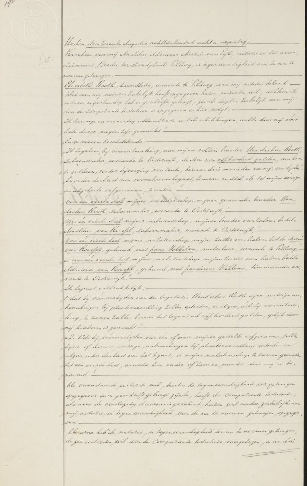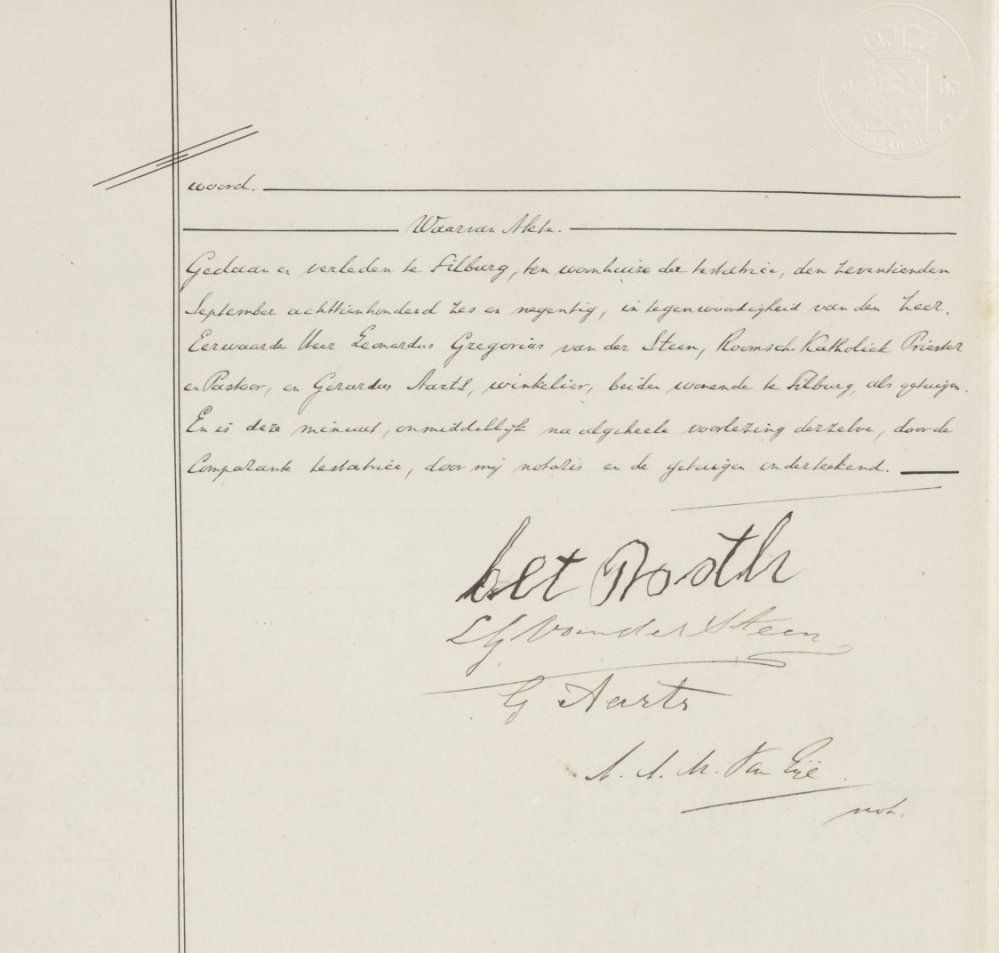 Zij woonde nog geen 14 dagen in Tilburg als zij een testament maakt (Notaris A.A.M. van Eijl, akte 6, scan 11, 27 augustus 1896):