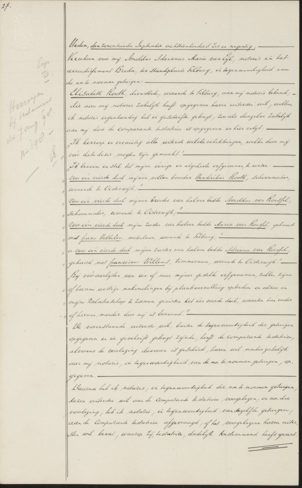 De vierde en vijfde akten betreffen ook testamenten. Het betreft testamenten van Elisabeth Rooth, ongehuwd overleden te Oisterwijk op 2 oktober 1911. Hoeveel testamenten zijn heeft gemaakt, is niet bekend, maar dat moeten er minstens twee zijn. Haar oudste bekende testament dateert van 17 september 1896 (notaris A.A.M. van Eijl, akte 27, scan 47, 17 september 1896):