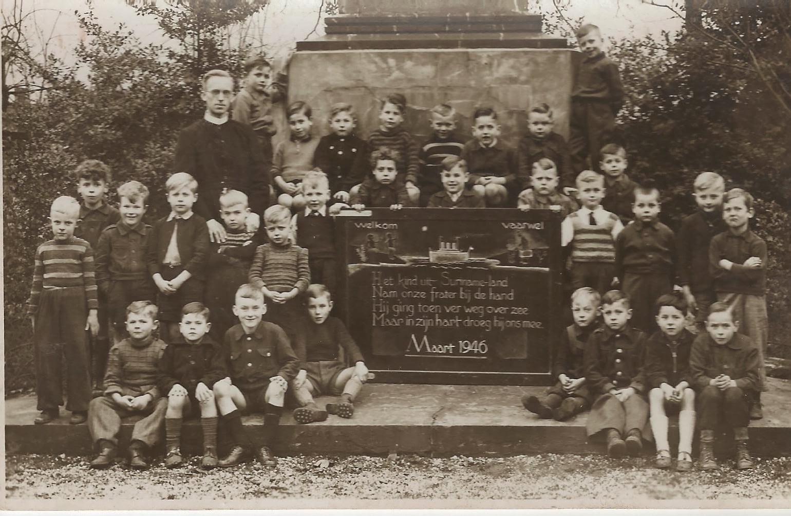 Maart 1946Soms bedremmeld, soms vrij uit in de camera kijkend staan de jongens van de Heilig Hartschool met hun frater-onderwijzer bij het standbeeld van Peerke Donders op het Wilhelminapark. Het standbeeld van Donders, ontworpen door Johannes Petrus Maas en Zonen, werd twintig jaar eerder onthuld in augustus 1926 door