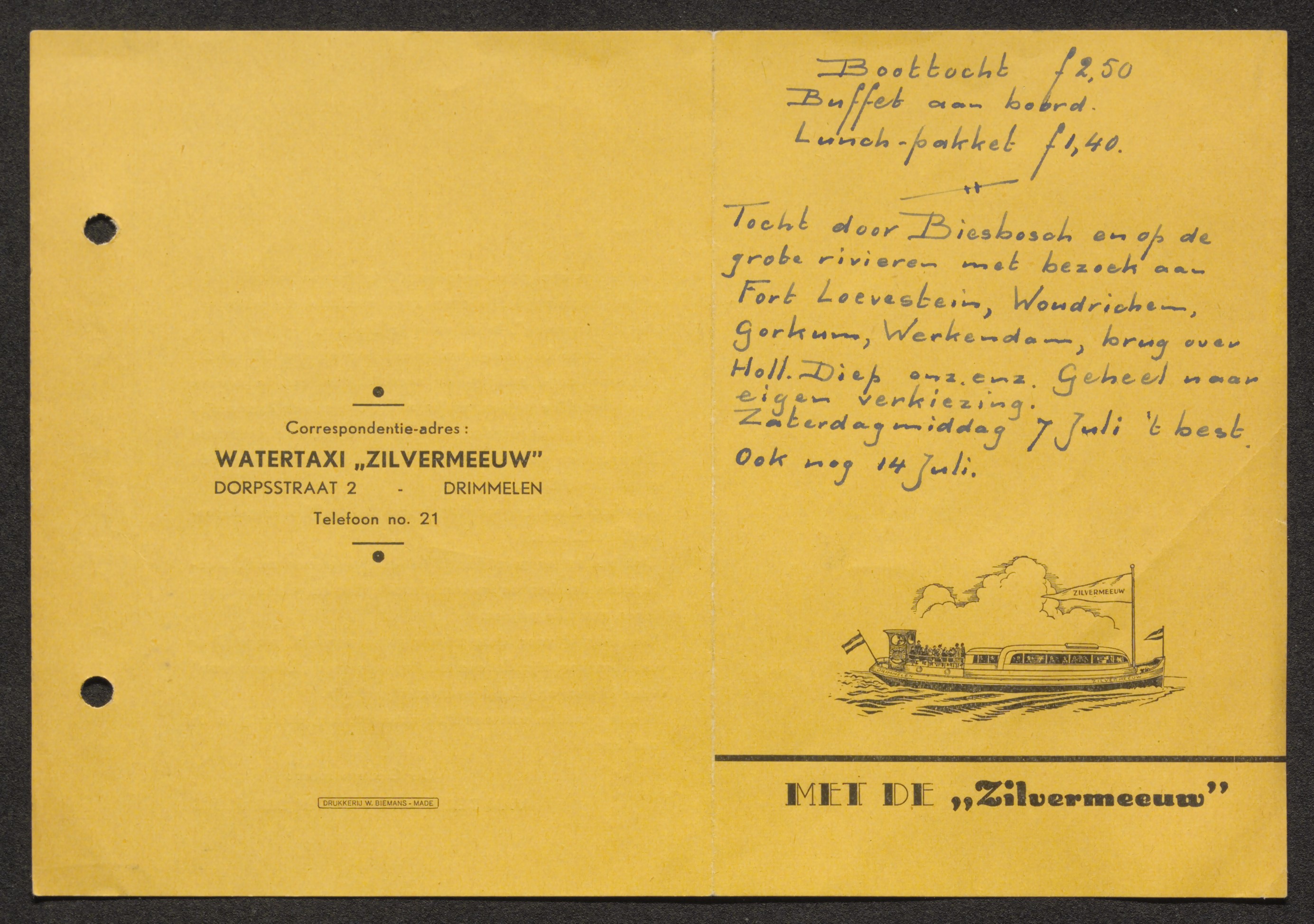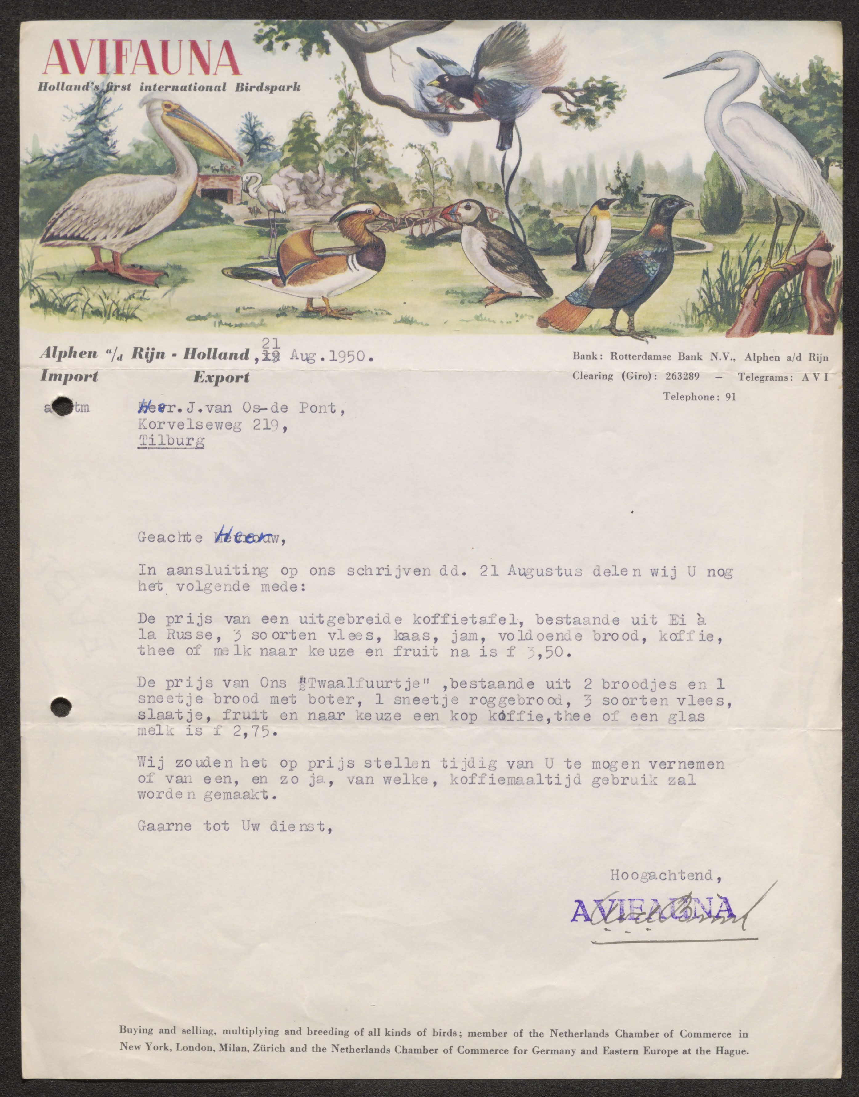 Statuten van de vereniging, twee schriften met harde kaft met daarin de notulen van de vergaderingen, correspondentie. De notulen geven een goed beeld van wat er speelt in de vereniging, de veranderingen in de loop van de jaren en hoe daarmee omgegaan wordt door bestuur en leden. De map met correspondentie bevat van alles! Van felgekleurde brochures van Avifauna, dierenparken en de floriade (bestemmingen voor mogelijke uitjes) tot een lid dat wegens doofheid zijn lidmaatschap opzegt, een wandelvergunning en een brochure van watertaxi "Zilvermeeuw".